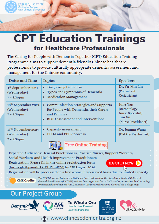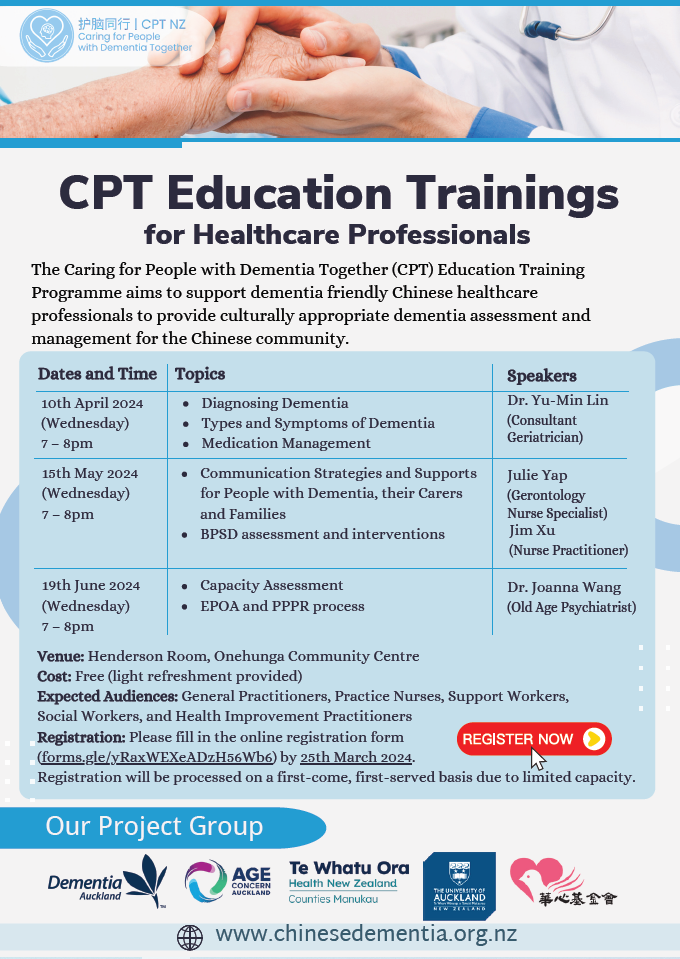 The Education Training Programme aims to support dementia friendly Chinese healthcare professionals to provide culturally appropriate dementia assessment and management for the Chinese community.